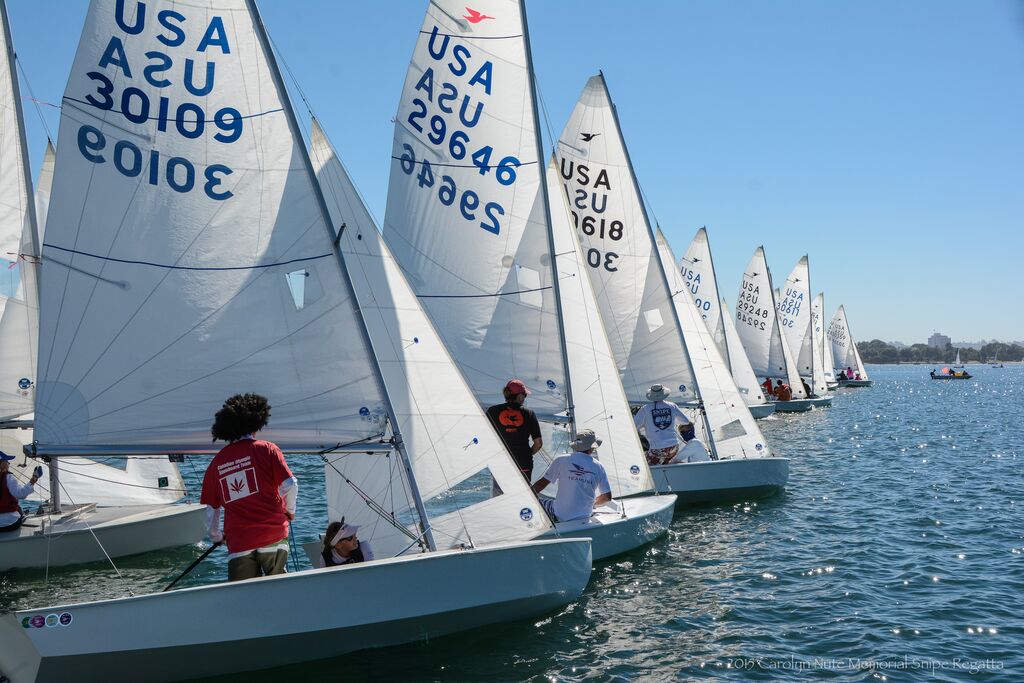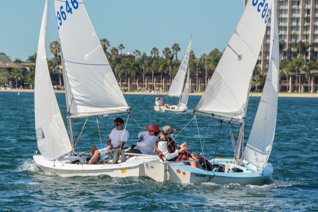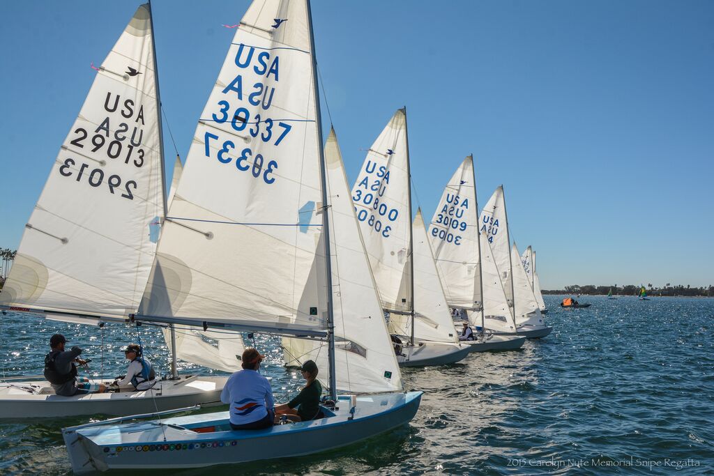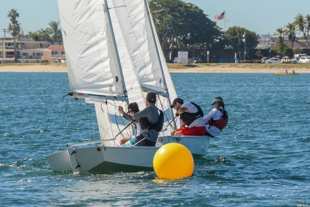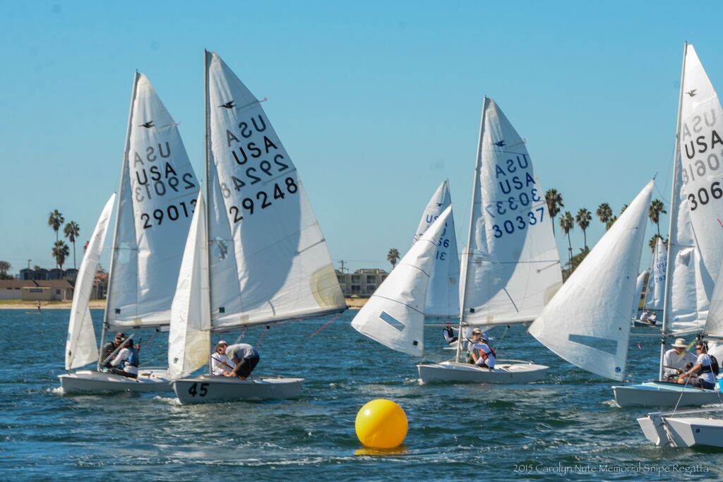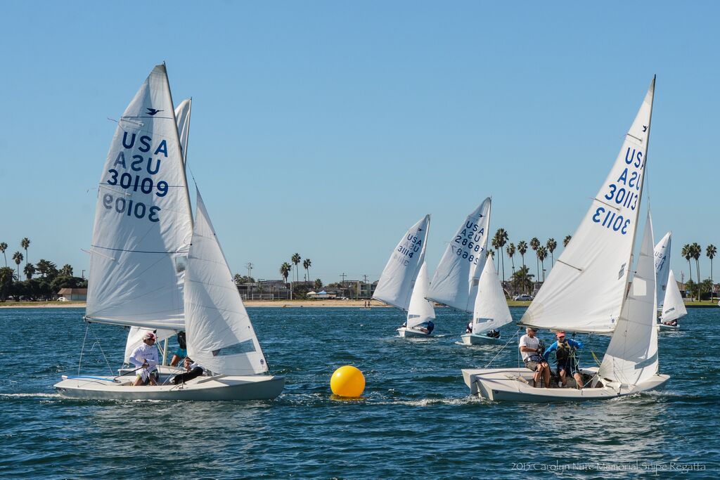 But even with the Santa Ana’s in the forecast, San Diego’s fleet 495 dove headlong into one of the best regattas of the year: The Carolyn Nute Memorial Regatta. With 23 teams registered, they rigged up on Saturday with the breeze blowing lightly from “the wrong direction”. But by the time the boats slipped off the sandy beach at Mission Bay Yacht Club, the breeze had turned around and filled in to a surprising 10+ knots. Things were looking up!