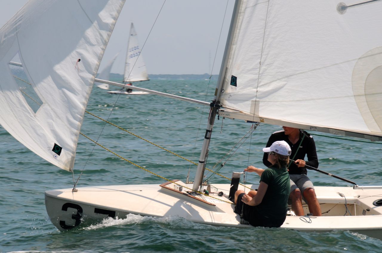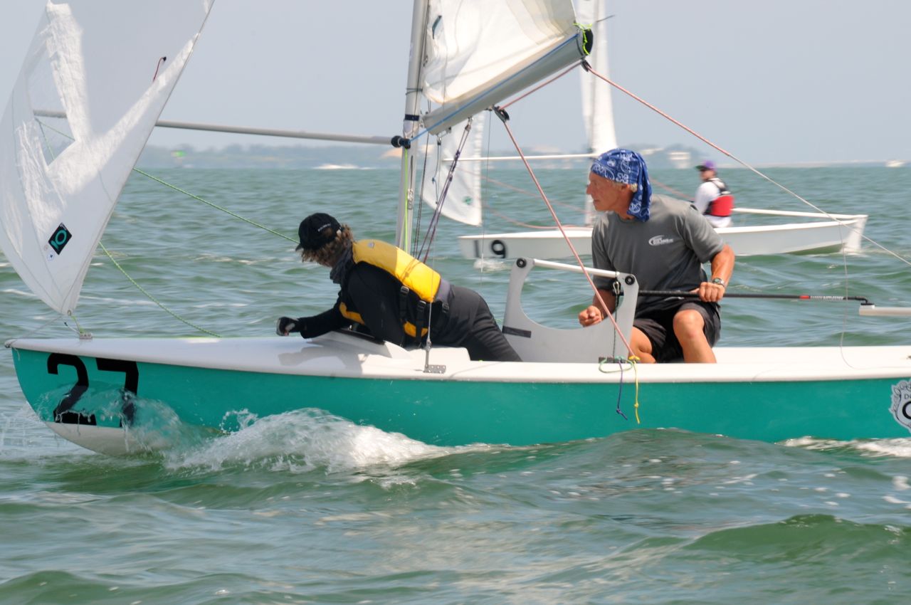 The breeze kicked in Sunday morning around 10:30, which worked out perfectly with the usual earlier start time. One race was completed in a steady 9 knot breeze that shifted left from the southwest. Raul and Augie, who had been duking it out the first four races, slipped back to ninth and tenth respectively this race, while Louis and Diego reclaimed the first spot. Closely behind were north-easterners Andrew Pimental and Nikki Bruno. Nick and Nicole came back as well for a final finish in third.