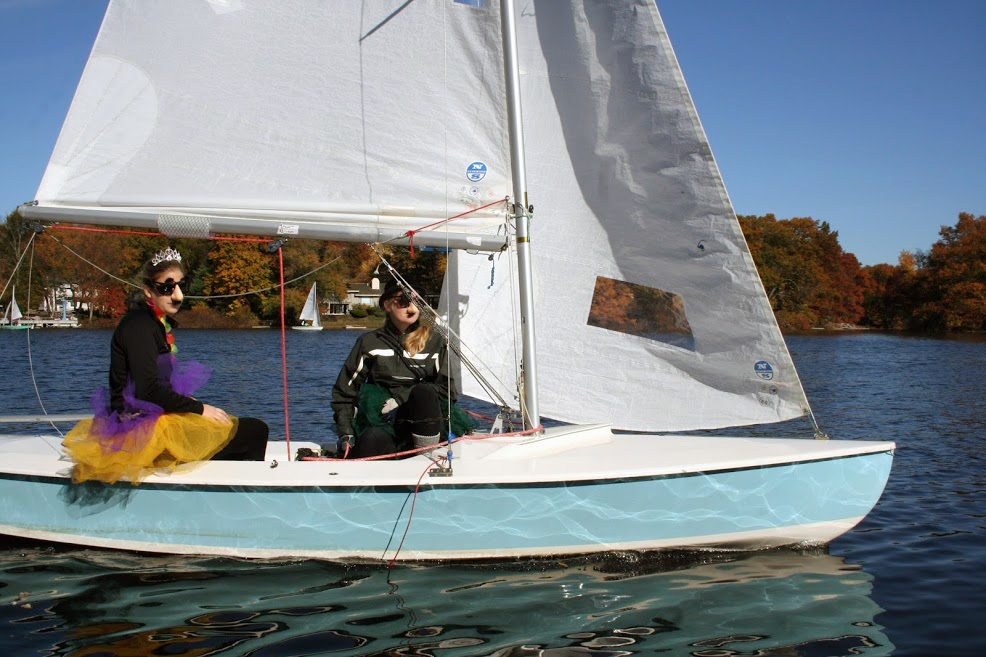 Racing was picturesque, unique and challenging, thanks to the seasonal oranges, golds and browns in the shore-side trees, the light and shifty winds (what else could be expected from the Mystic Lakes?), and races sharing the same course as a college regatta. On-lake costumes included pirates, zebras, Wizard of Oz characters, devils, people-with-tutus-and-glasses-and-big-noses, one rifle-wielding skipper with some undetermined fuzzy-headed critter crew, some caped character, balloons-as-mast-head-flys and more. And it was great to have Shan MacAdoo (with crew Catherine Devlin) back on the water again!