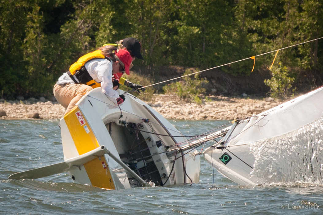 Conditions on Guelph Lake were ideal over the weekend for the Canadian Snipe Championship/Ontario Open. Day one was breezy, with gusts topping 25 knots. Over the course of the first three races, the ten boat fleet was reduced to five, as several dramatic capsizes, gear failures, minor injuries, and general mayhem ensued. PRO Irene McNeill sent the fleet in for the day as the breeze continued to build into the late afternoon.