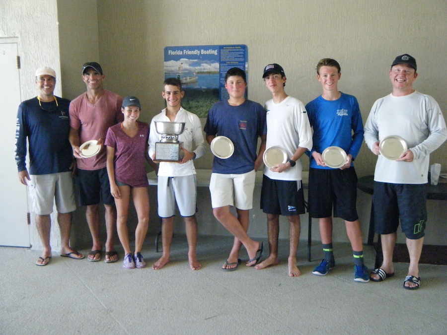 360) The trophy winners and some of the competitors. From Left: Roberto Guaragna crew, Ernesto Rodriguez crew, Isabel Guaragna Skipper, the Florida State Jr. Champion, Eddie Mintzias holding the Perpetual Trophy, Second Place Skipper and crew, Paul Lobree and Alex Sidi and Third Place Skipper and crew Jonathan Gleason and Art Gleason