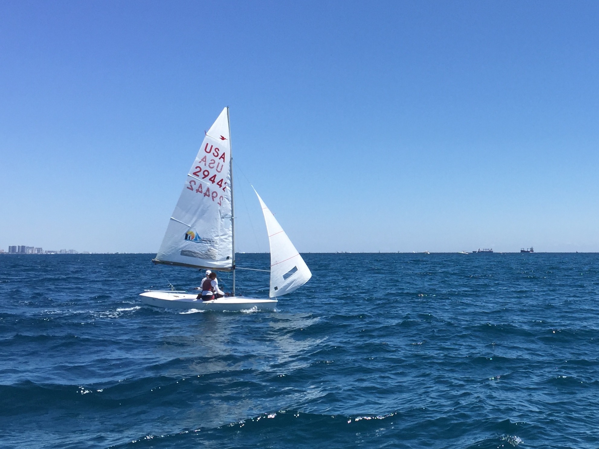 Fort Lauderdale, May 7, 2016. Regatta report, photos and results The annual Ron Payne Memorial Regatta was sailed May 7th in the ocean off of the Dania Beach Pier, with the Ft. Lauderdale Air and Sea Show in the background to the north of the course. It was a spectacular day all around. Winds were moderate (8-12 knots, with some big holes until the wind steadied toward the end of the day). The wind started from the west, with challenging shifts, and moved 180 degrees to the right during the day. Add in current (counter-current flowing south for the first two races, switching to north for races 3-6) and chop going every which direction, and both sailors and race committee were working hard to process all! Host, Lauderdale Yacht Club, well-handled the varying conditions, with world class sailor Tom Lihan as PRO running the races. All 6 races were fair and held in comfortable, sunny, bathing suit weather. ...