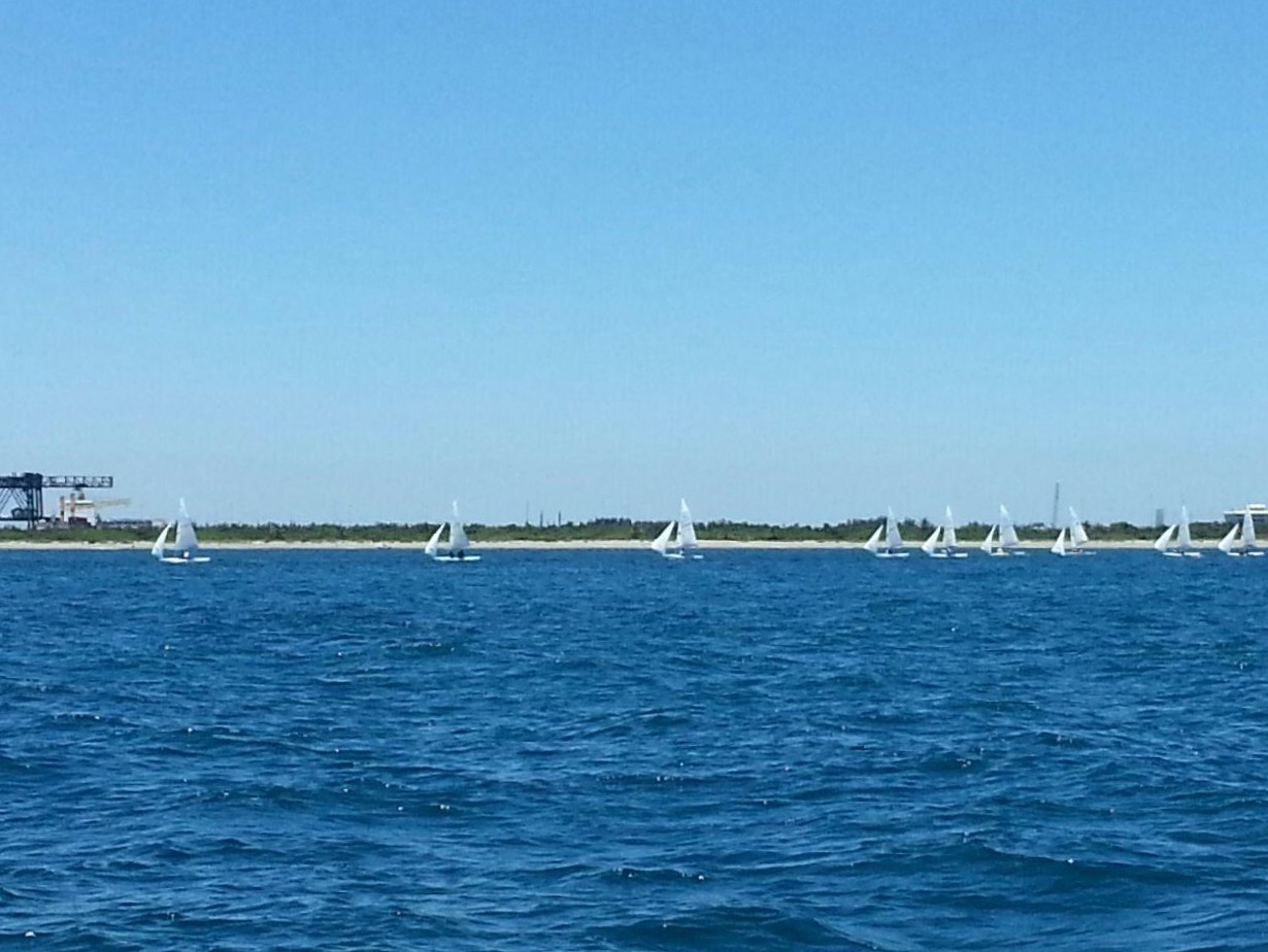 The annual Ron Payne Memorial Regatta was sailed May 7th in the ocean off of the Dania Beach Pier, with the Ft. Lauderdale Air and Sea Show in the background to the north of the course. It was a spectacular day all around. Winds were moderate (8-12 knots, with some big holes until the wind steadied toward the end of the day). The wind started from the west, with challenging shifts, and moved 180 degrees to the right during the day. Add in current (counter-current flowing south for the first two races, switching to north for races 3-6) and chop going every which direction, and both sailors and race committee were working hard to process all! Host, Lauderdale Yacht Club, well-handled the varying conditions, with world class sailor Tom Lihan as PRO running the races. All 6 races were fair and held in comfortable, sunny, bathing suit weather.