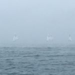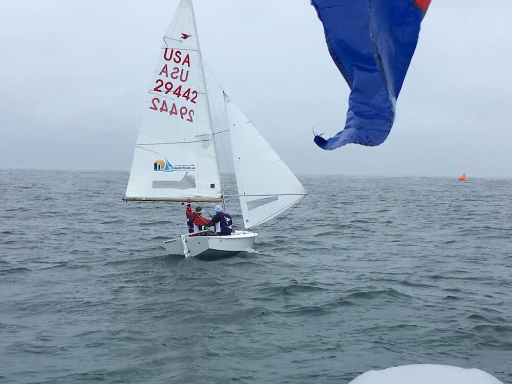 On Sunday, the temperature plummeted into the 50’s, very chilly for Florida. With the water warmer than the outside temperature, a mist appeared all over the course, as heat rose from the water. The cold front that had gone through earlier in the morning left for Sunday’s racing light, even spottier and shiftier wind from the northwest (2-9 knots). Ratcheting up the difficulty, a disproportionate chop beat up the boats every time they tried port tack.