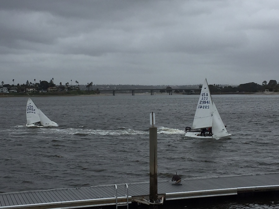 Mission Bay, January 22, 2017. The results stand after one day of racing – 7 races- as a major winter storm bore down on California Sunday. Only two intrepid junior teams (training for Jr Worlds) braved the elements in 20++ knots on Mission Bay with Doug Hart coaching while many of the fleet stood on shore, under heaters (with bloody mary’s in hand) watching …