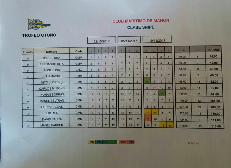 Mahon, November 19, 2017. Results after 11 races (1 discard)