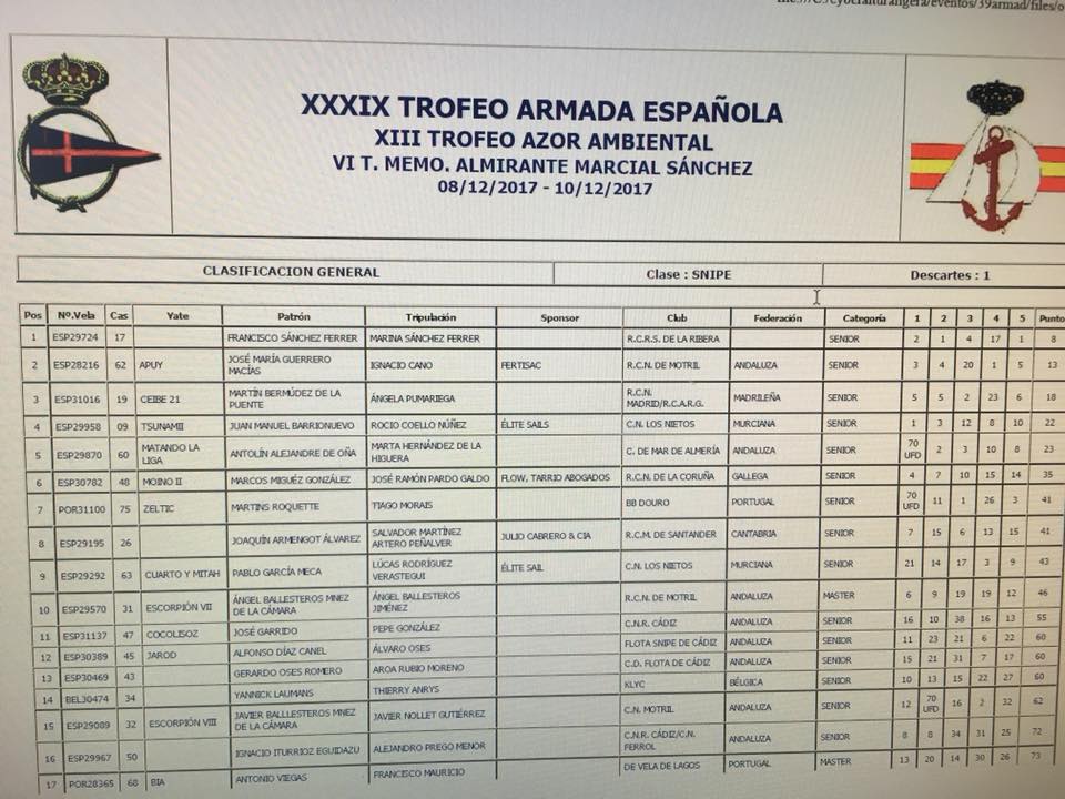 Santiago de la Ribera, December 10, 2017. Results after 5 races (1 discard)