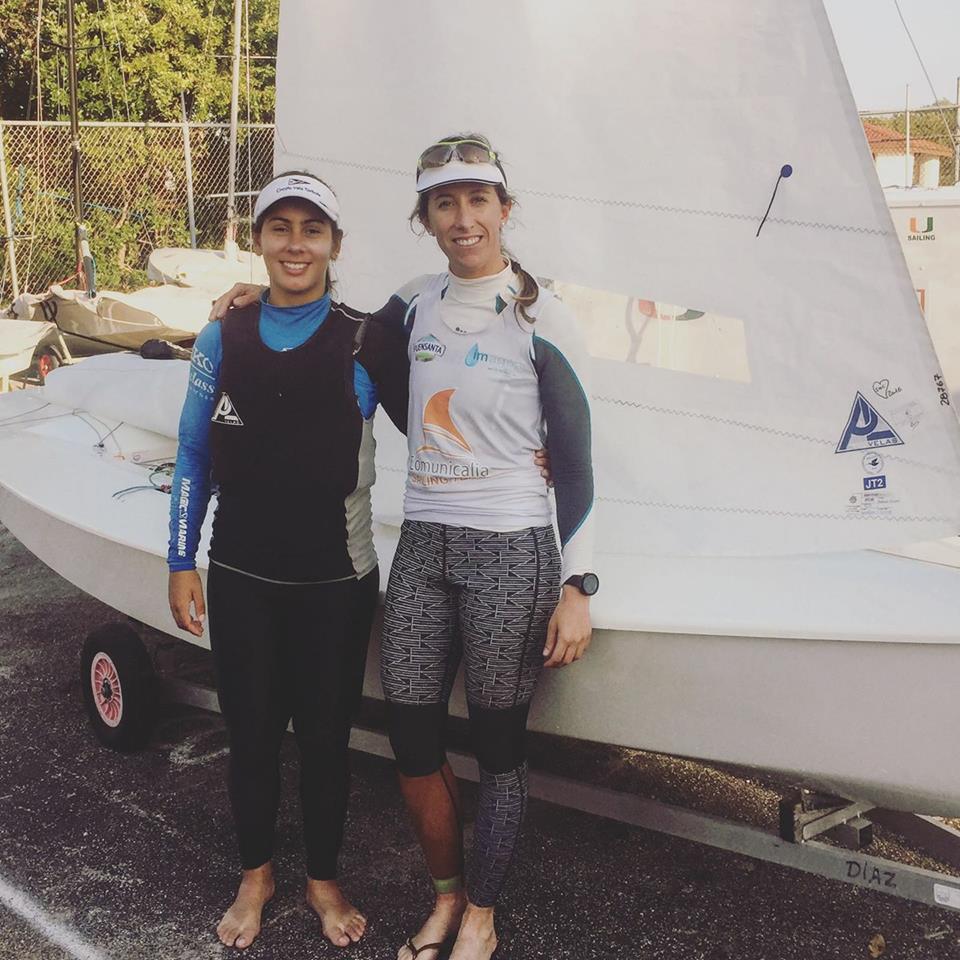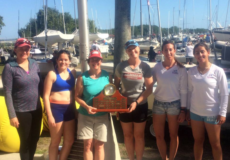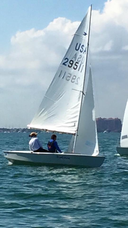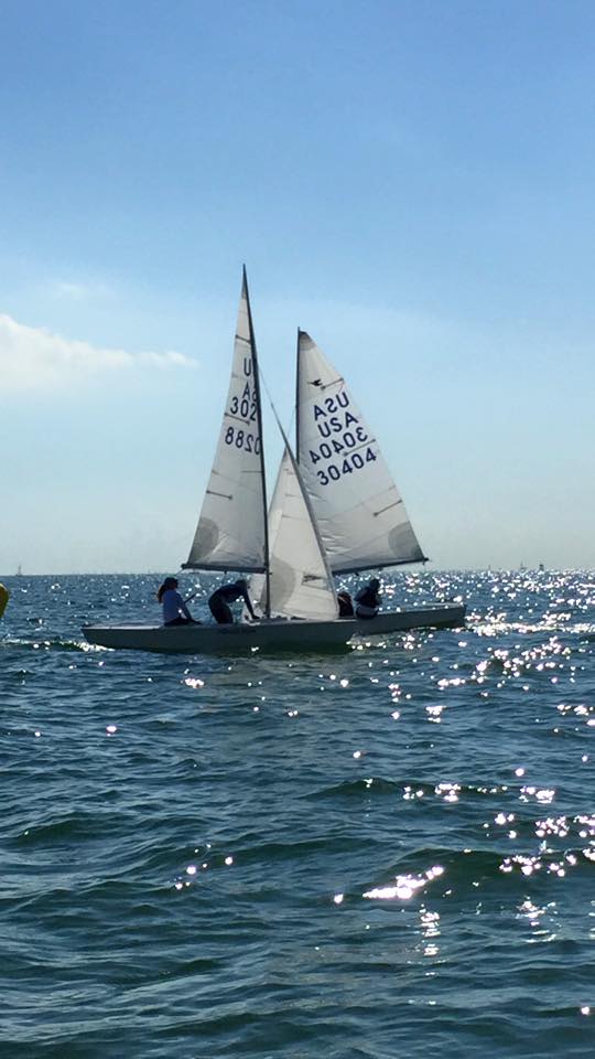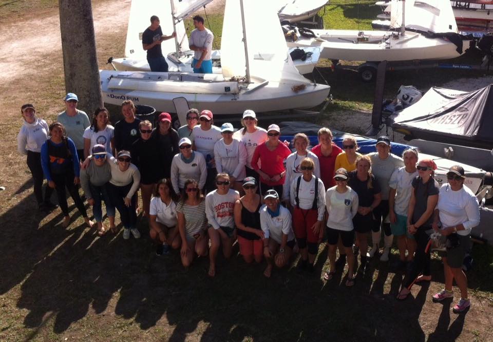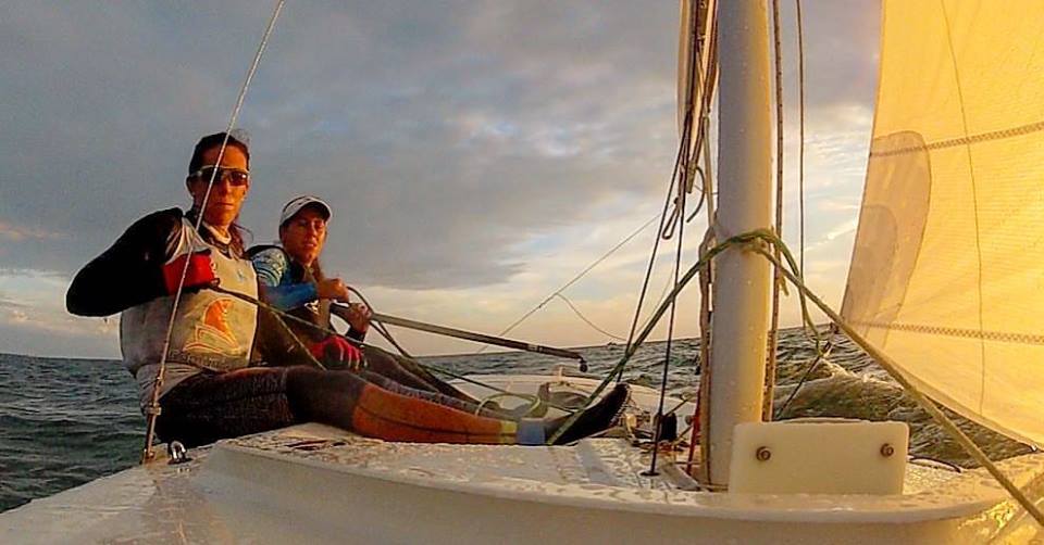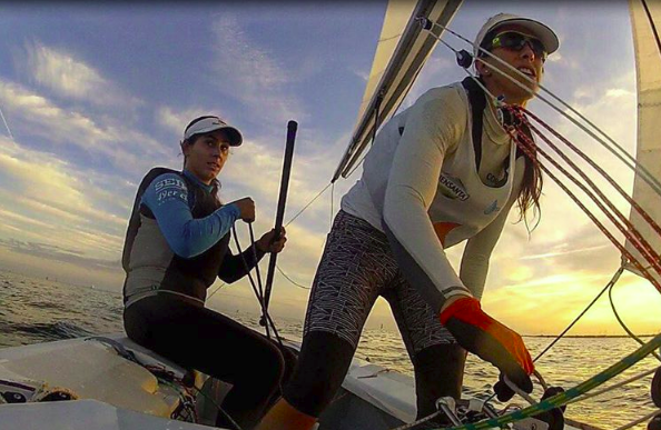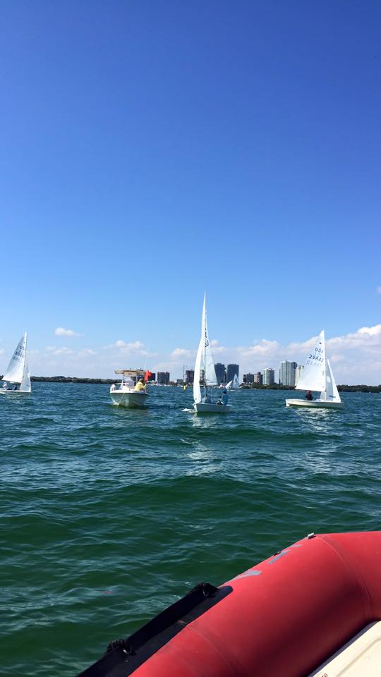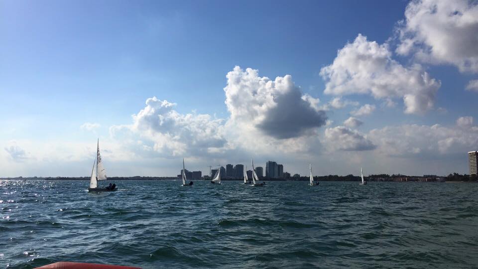 Miami, February 5, 2017. 16 teams completed 6 races over two days on Biscayne Bay. Dominated by light air, we did get to stretch our hiking legs on the last race of the first day. Mafalda and Angela were able to come back from a slow start in today’s only race to win the regatta with all firsts and one second. Lisa and Lexi Pline won today’s race; Carol Cronin/Kim Couranz will take home the US Women’s Nationals trophy, an elegant ship’s clock.