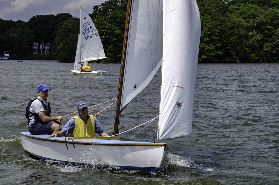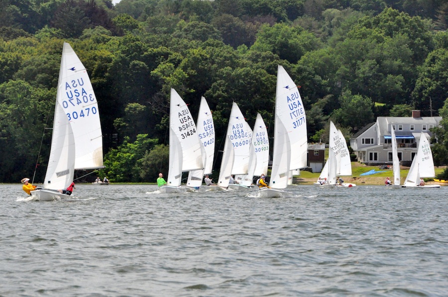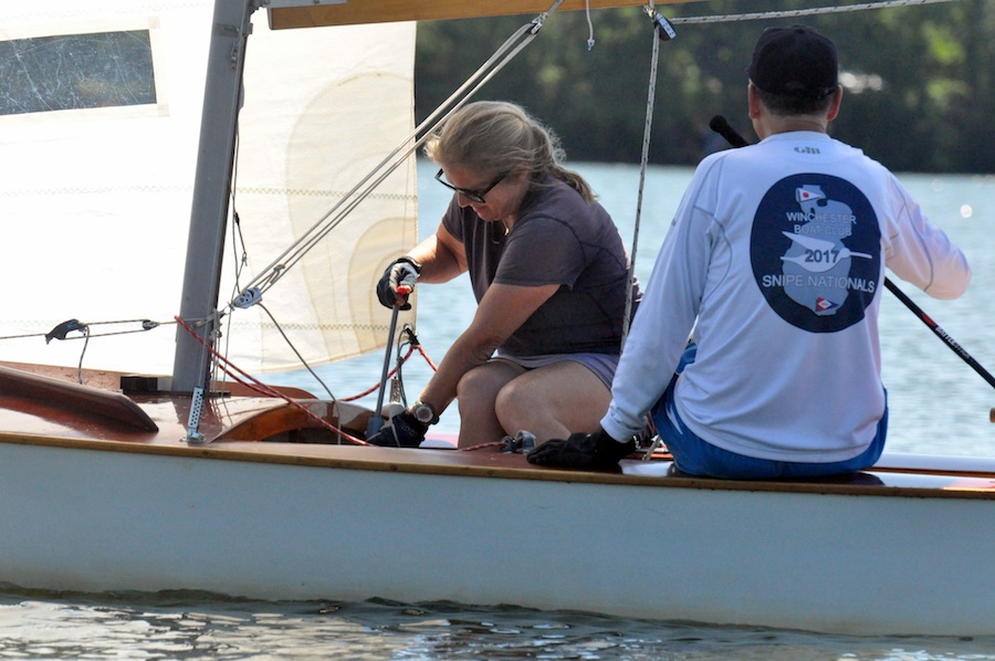 Winchester, July 8-9, 2017 Report by Art Rousmaniere Jim Bowers claims his 19th Winchester Invitational crown Jim Bowers and Julia Rabin recovered from an OCS and capsize on the first of 8 races to eek out the most consistent and top-dating team of Cam Fraser and Liz Glavinski by 1 point over a weekend of gorgeous westerlies on the Mystic Lake outside Boston. Except for Jim and Julia's double boo-boo to start the weekend, the two teams finished no more than 3 boats apart all weekend. Top spouse team of Jock and Myrna MacRae took third while the daughter-mother Katie and Sarah Levinson broke the tie for fourth with current Tufts sailing team members Nick Giacobbe and Laura Dienemann. ...
