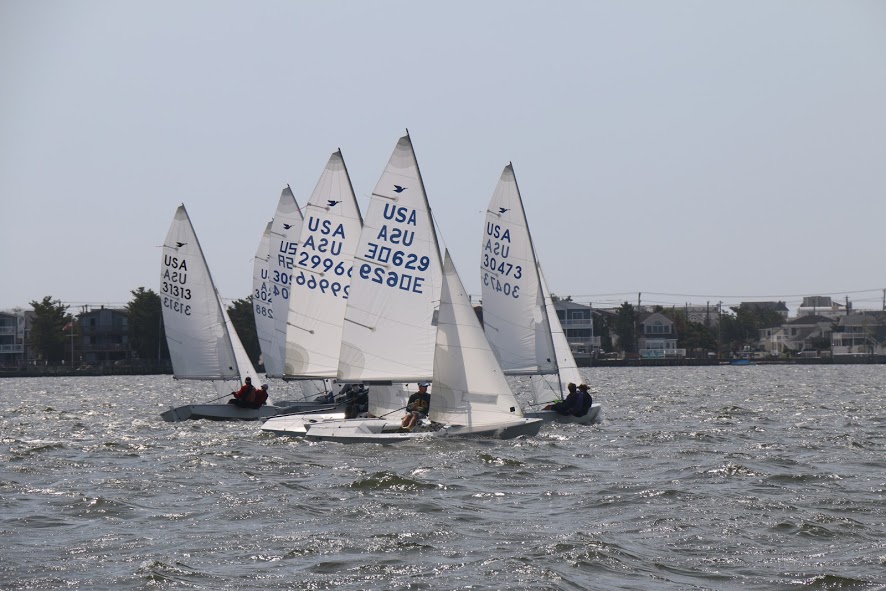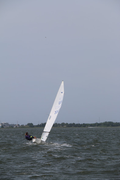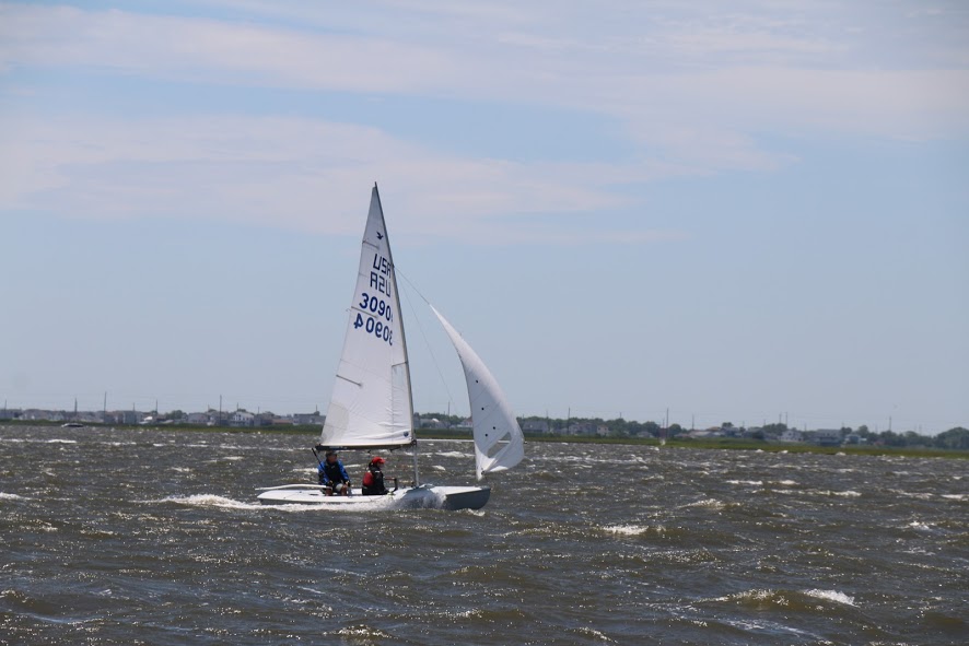 Great fun at Surf City Yacht Club on Manahawkin Bay in New Jersey this weekend with really sporty 15-20 knot breezes both days. The big talk on Friday night was the wind prediction to build to 25+ knots for the entire weekend. Saturday we sailed out to the usual racing area to the west of the channel, knowing the breeze would build to an unraceable strength by 1pm but figured we could bang off two double triangle races prior to that. Arthur Blodgett/Charlie Bess were clearly a bit faster than the rest as the breeze built. They consistently got to the weather mark first and did not have to look back. With the breeze building, the fleet quickly found its hierarchy with Blodgett/Bess with two firsts, Lee Griffith/Nikki Bruno two seconds, and Alex/Lisa Pline with two thirds. After the second race, I was thinking we can probably get in another, but the RC wisely chose to postpone for the rest of the day. Good move as during the sail in, the main was luffing and we were carrying a bubble in the jib, my indicator for 25 knots or so.