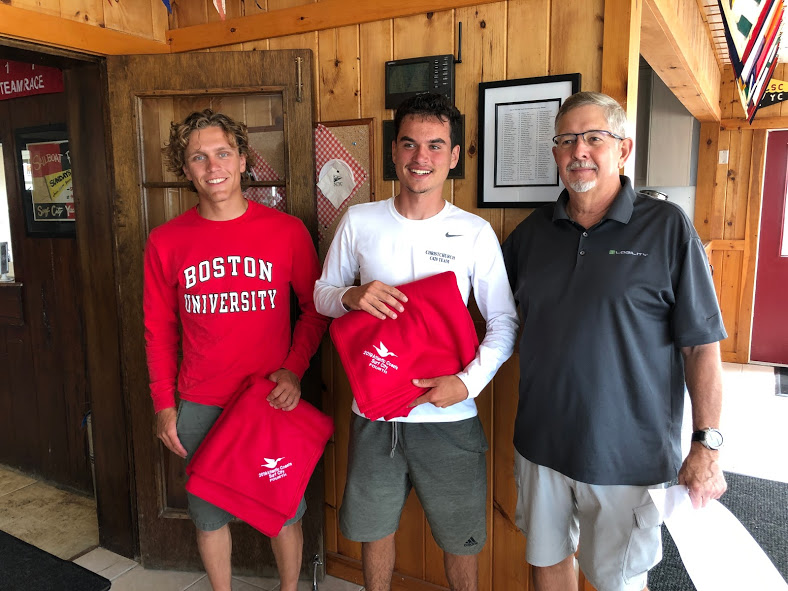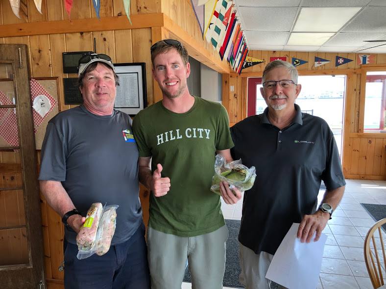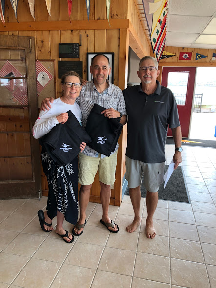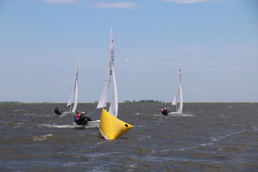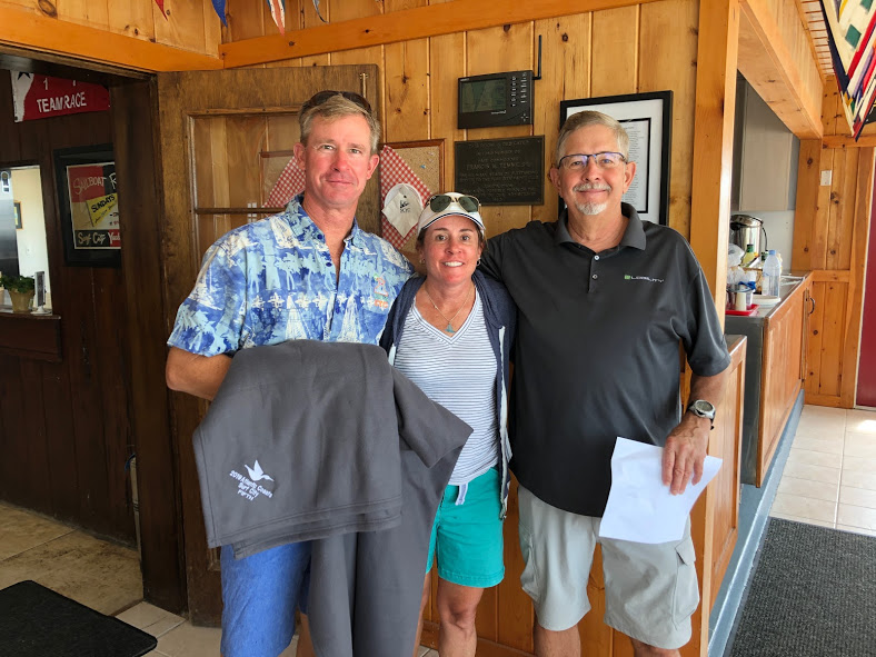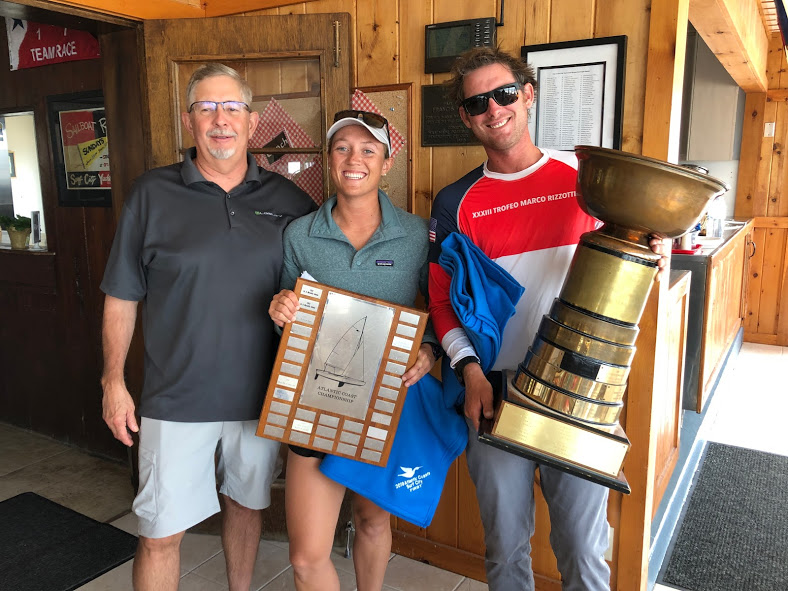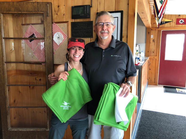 On Sunday morning after hemming and hawing about the breeze and the even higher forecast predicted in the next several hours, we decided to put the course to the east of the channel (the club side of the bay) which made it a lot more protected, but limited the course to a Windward/Leeward. Everyone thought that was a good compromise and we headed out. The racing was very tight in both races with positions changing frequently in the shifty and puffy conditions. After two races, again the RC called it for the day as the breeze did in fact get back to 25 knots just after we headed in. Ultimately, Arthur/Charlie managed two firsts and Lee/Nikki two seconds and Alex/Lisa Pline came out of the tie breaker for 3rd and 4th over Tyler Mowry and Lucas Masiello. This event also was the US District 1 and Atlantic Coast Championships and both were awarded to Arthur Blodgett/Charlie Bess who with the winners’ prerogative declared the ACCs would be hosted again next year at Surf City.