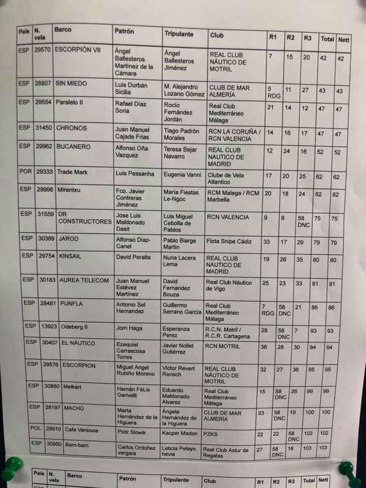 En segundo lugar han quedado los andaluces Álvaro Martínez Iribarne e Ignacio Cano, del Real Club Náutico de Motril, y terceros los canarios Gustavo y Rafael del Castillo, del Real Club Náutico de Gran Canaria.