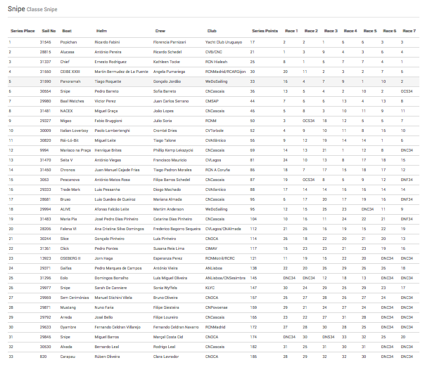 | 6 | 30554 | Snipe | Pedro Barreto | Sofia Barreto | CNCascais | 36 | 13 | 5 | 4 | 2 | 10 | 2 | OCS34 |