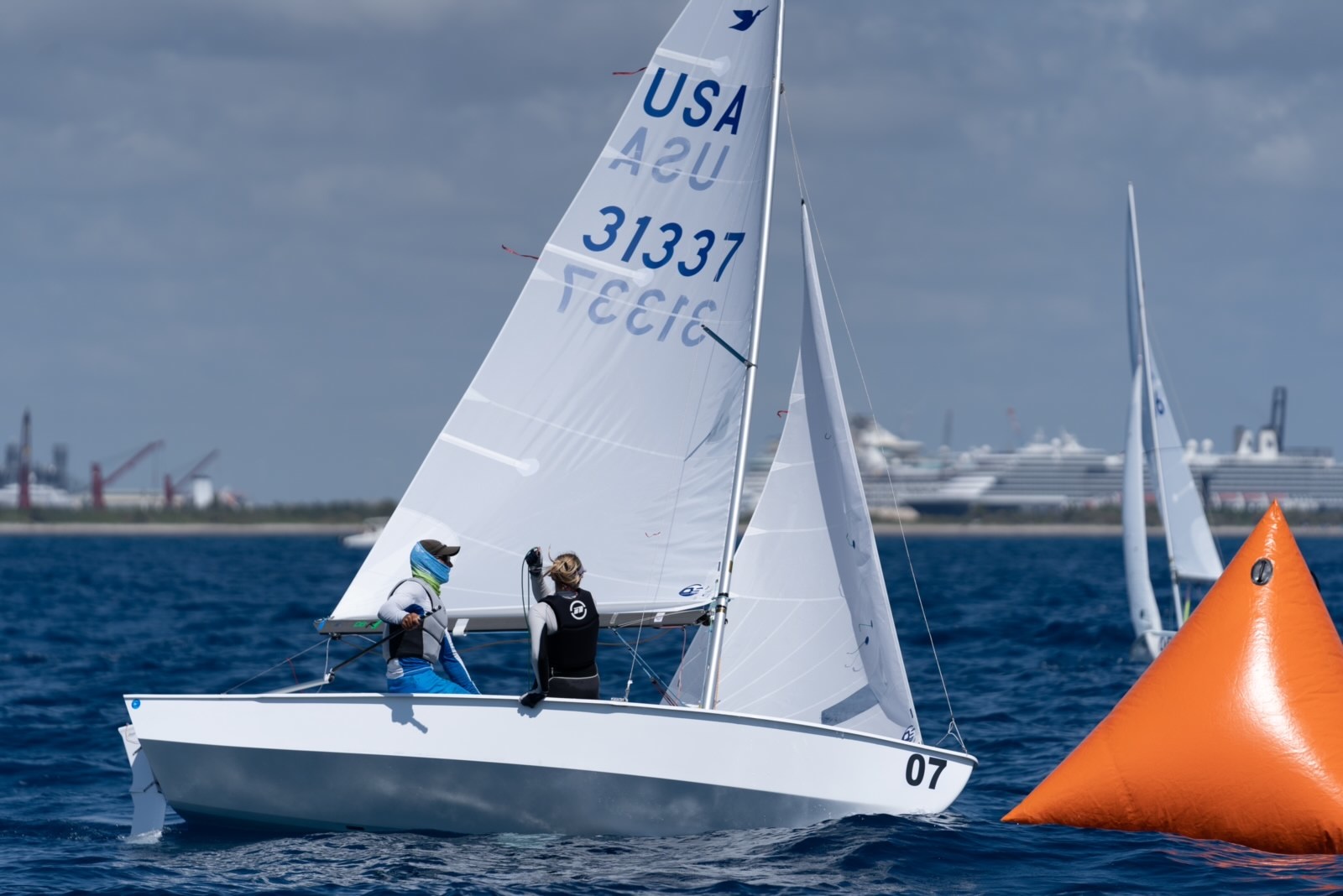 From Lauderdale Yacht Club’s docks (on a protected canal off the Intercoastal Waterway) to the race course was a 45-minute sail out through Port Everglades, a commercial port that always has cruise ships, container ships, and fishing boats of all sizes and abilities entering and exiting. Escorted by a fleet of LYC safety boats, the reward was the excellent sailing outside: 75 degree water, 80 degree air, ocean swell, and—of course—Florida sunshine.