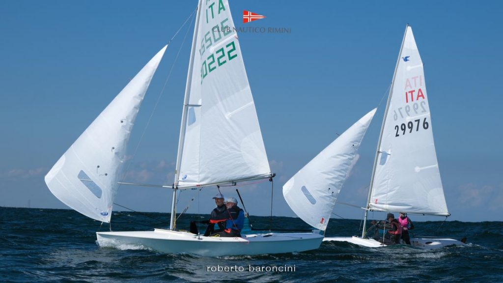 Ma veniamo alle regate. Sabato le condizioni sono particolarmente impegnative con vento di Libeccio, detto Garbino, rafficato fino a 25 nodi. Nella prima prova uno strepitoso Marco Onorato con la compagna Alessia Carcassola –Generazione Z,- sono autori di un ‘ultima poppa velocissima e riescono a sopravanzare i veterani Sangiorgi – Minardi e Perdisa –Ceccarelli, poi una sfilza di entusiasti giovanissimi della Generazione Zeta: Francesca Lavezzi – Riccardo Duca e poi Davide Presotto – Diego Rosa e Ernesto Grazia – Edoardo Guidi. Seconda prova ancora più impegnativa con il vento in rotazione destra e raffiche ancora più forti che provocano varie scuffie . In questa condizioni i campioni diversamente giovani del circolo velico Ravennate Paolo Sangiorgi – Andrea Minardi precedono di qualche metro all’arrivo i coetanei Alberto Perdisa –Marco Ceccarelli e la bravissima Generazione Z Alice Stella con a prua il babbo Giovanni. Poi un ottimo Davide Presotto con Diego Rosa a precedere Lavezzi – Duca e Grazia – Guidi. Tutti giovanissimi del Centro Velico Città di Riccione e allievi di coach Paolo Fuzzi che per meriti sportivi e autorevolezza si è da tempo guadagnato il soprannome di “Ammiraglio”.