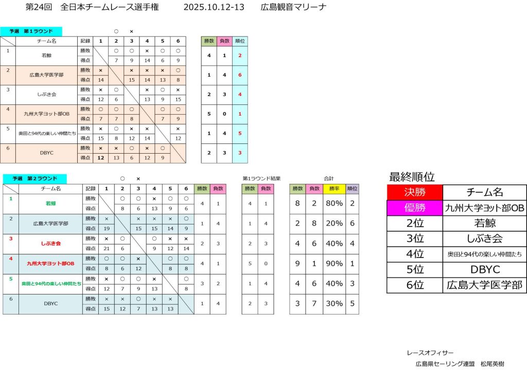 Hiroshima, Japan, October 13, 2025. The 24th All-Japan Team Racing Championship (2025) was held at Hiroshima Kannon Marina on October 12th and 13th. In addition to local Hiroshima adult and university teams, the regatta also saw many participants from outside the prefecture, with a total of 6 teams and 50 participants.