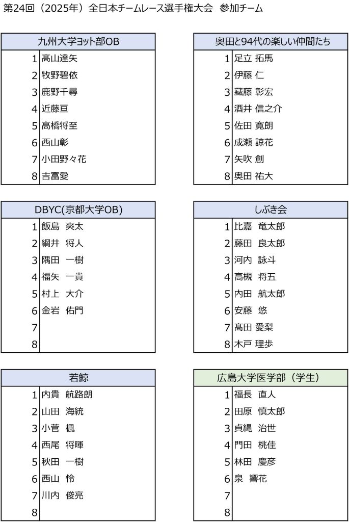 The six teams competed in a round-robin format in the first and second qualifying rounds, and the top four teams advanced to the finals based on their results. The semi-finals (a three-race knockout format) featured a battle between two-time defending champions, Kyushu University Alumni, another Kyushu University Alumni team, first-time Doshisha University alumni Wakakujira, and local Hiroshima University alumni Shibuki-kai.