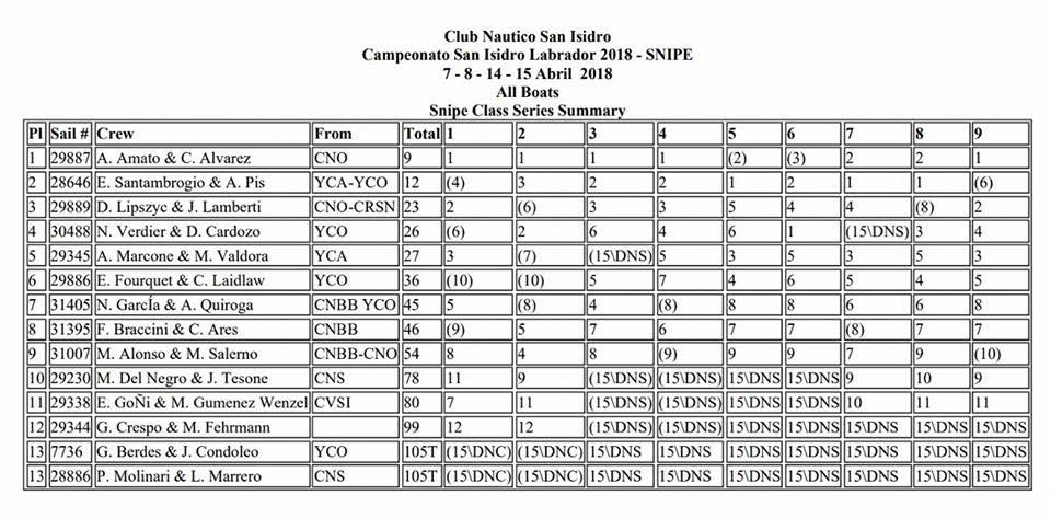 Buenos Aires, April 15, 2018. Final results after 9 races (2 discards)