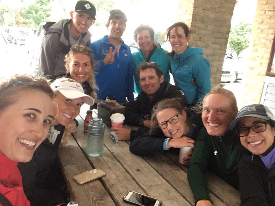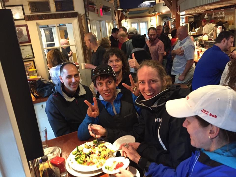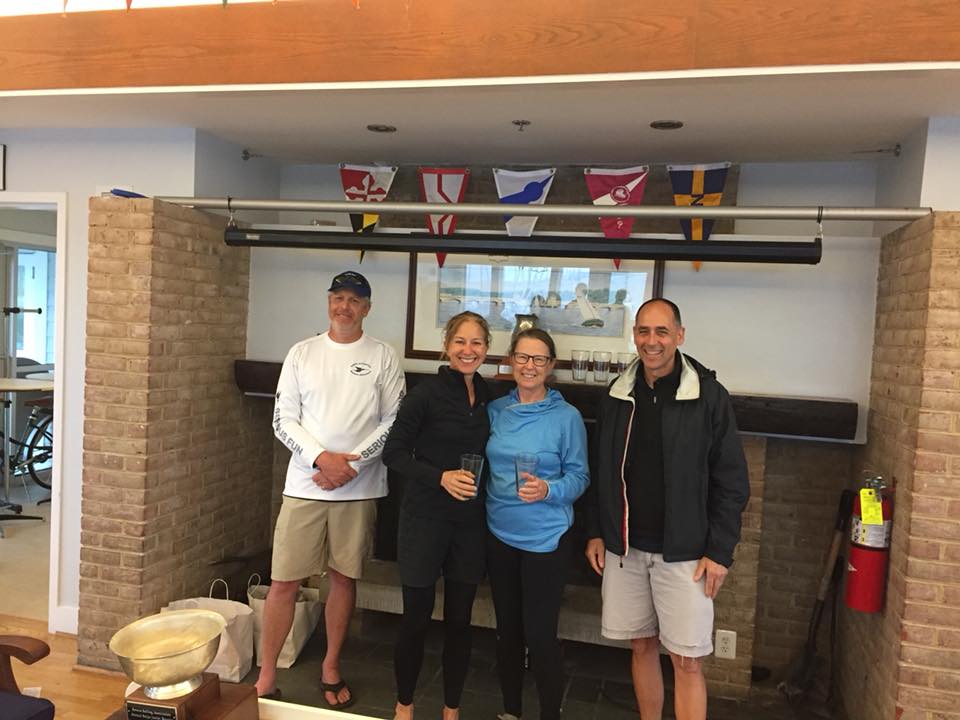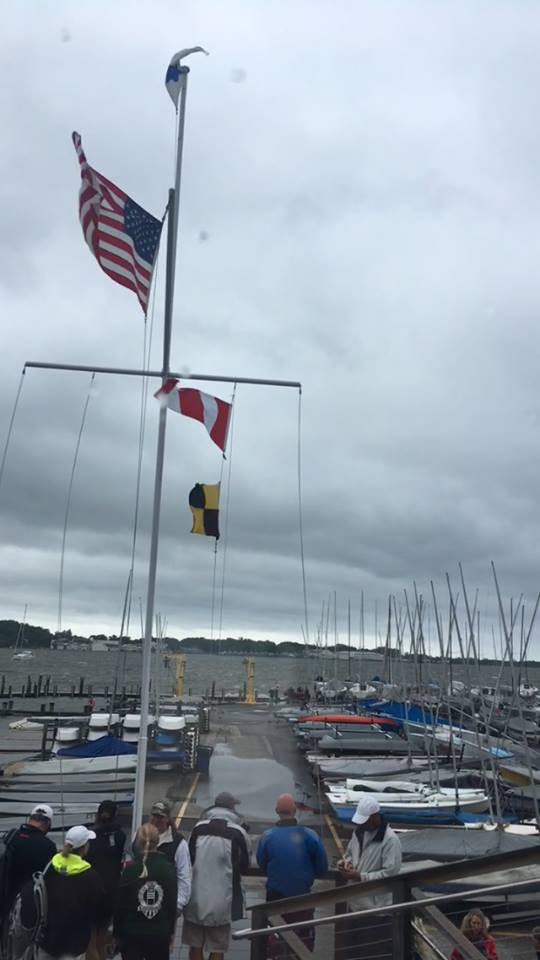 Unfortunately, Sunday’s forecast for big breeze and lots of rain did hold true. When sailors arrived at Severn Sailing Association Sunday morning, a weather buoy on the race course was reporting a steady 25 with gusts to 30 knots, so the Race Committee, led by Principal Race Officer Steve Podlich, decided to postpone on shore to see if the wind would ease off a bit. Sailors enjoyed a hearty breakfast from SSA’s snack bar as they awaited final word–and after about an hour it became clear that the wind would not cooperate. The regatta wrapped up with the standings from Saturday’s racing as final.