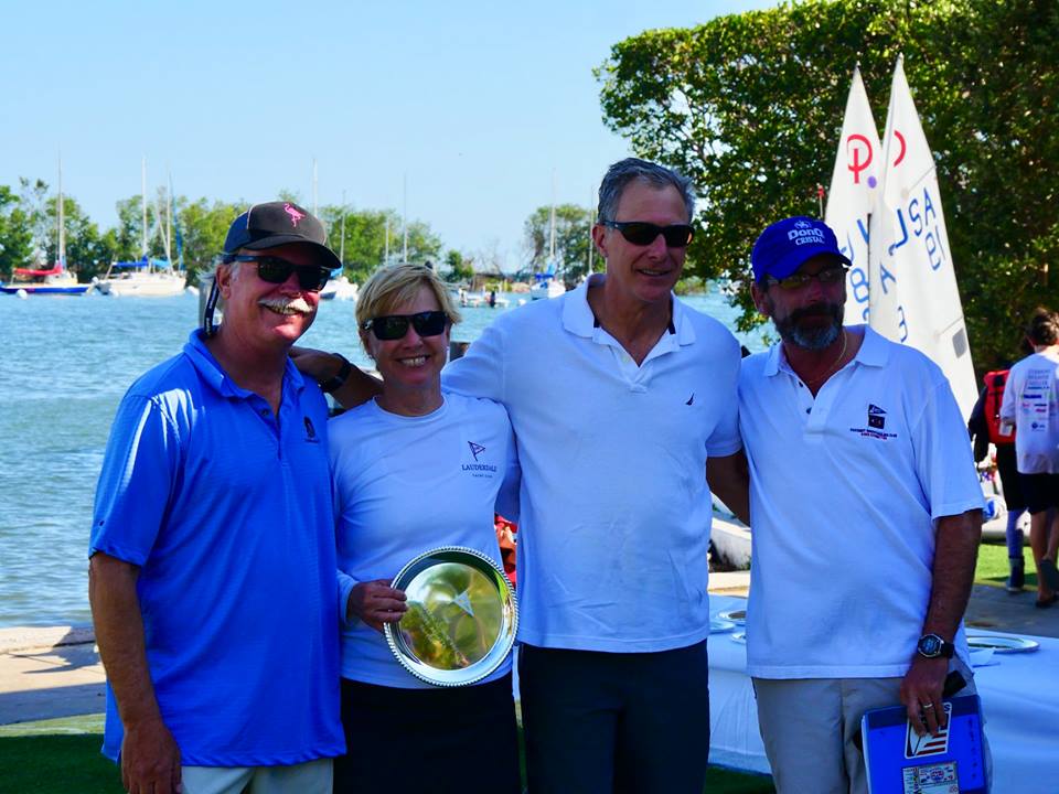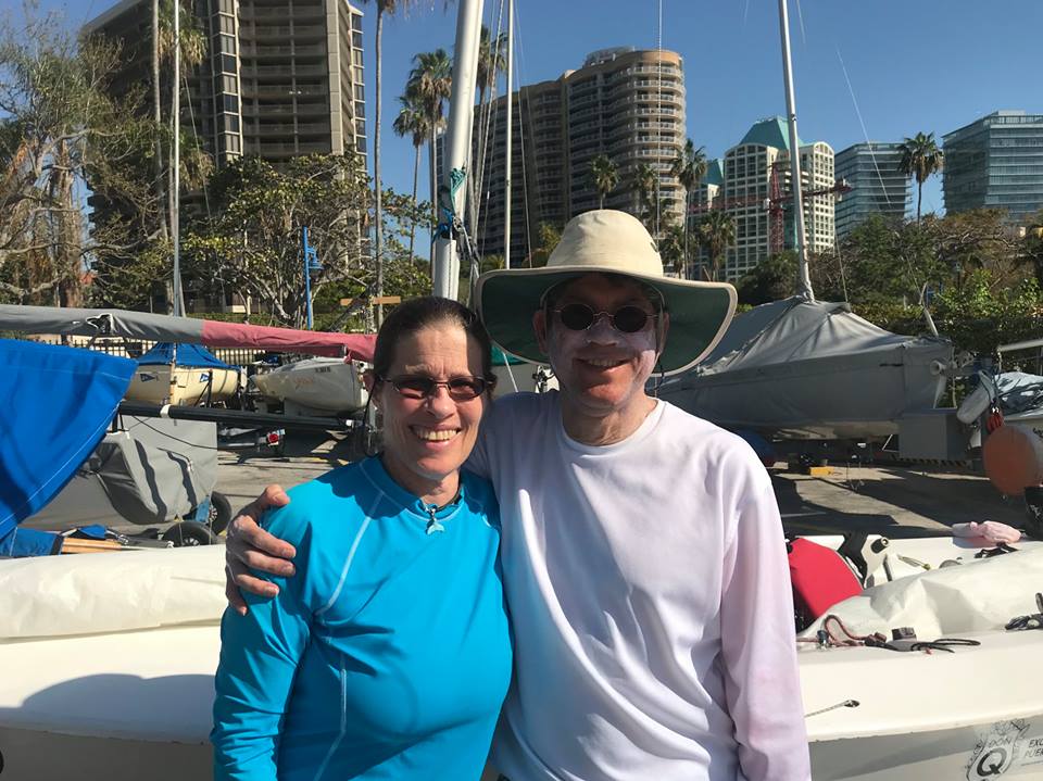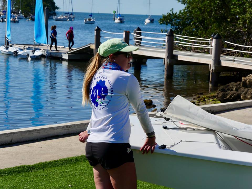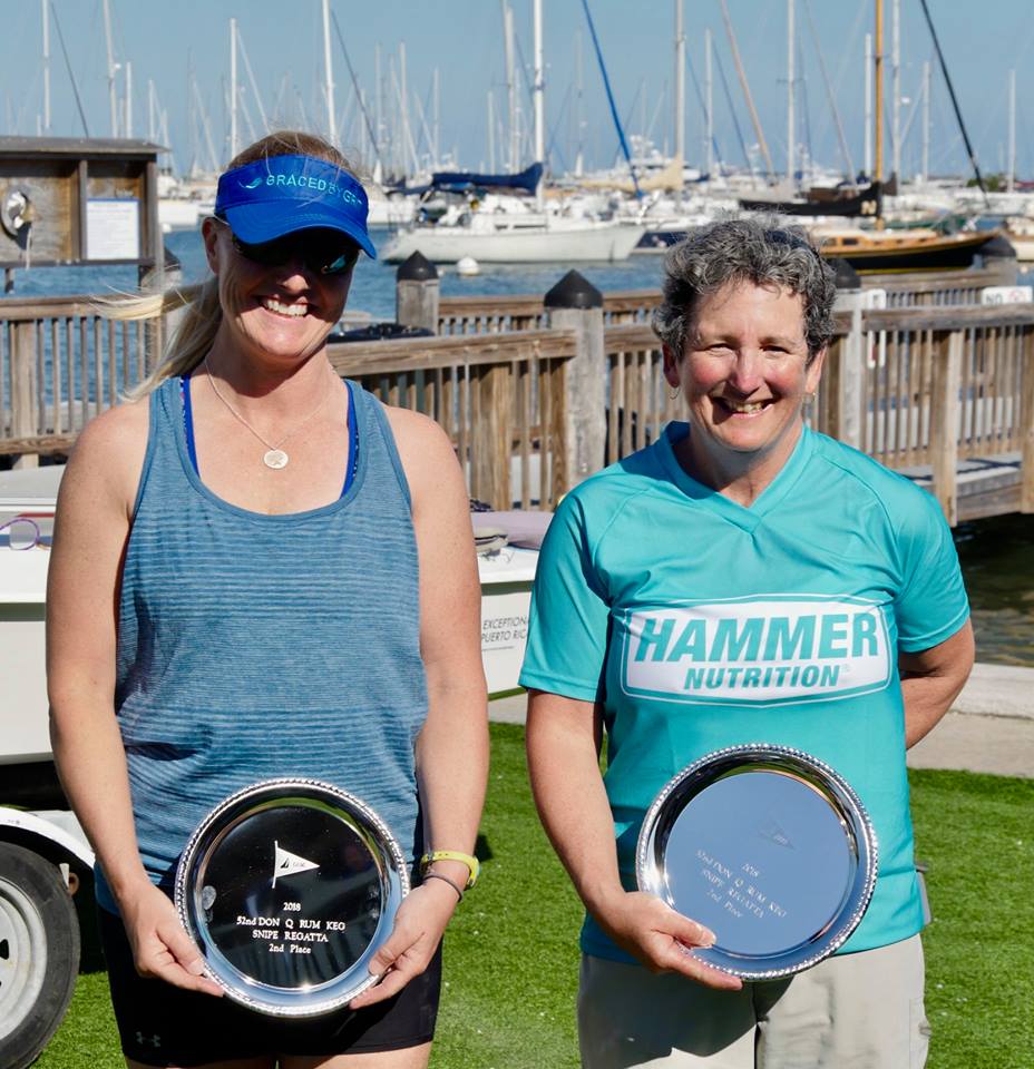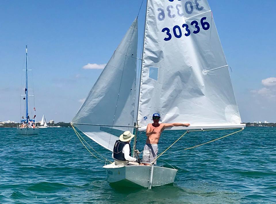 Saturday’s breeze was a little lighter and righter, and less predictable than the usual Biscayne Bay with shifts and puffs filling from both sides. Ernesto and Kathleen finally managed to sail a drop race (a second, behind George Szabo/Diana Waterbury). Carol Cronin/Kim Couranz moved up to second overall with three top six scores, but the points remained close going into the final day.