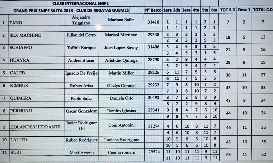 Salta, Argentina, October 7, 2018. Final results after 6 races (1 discard)