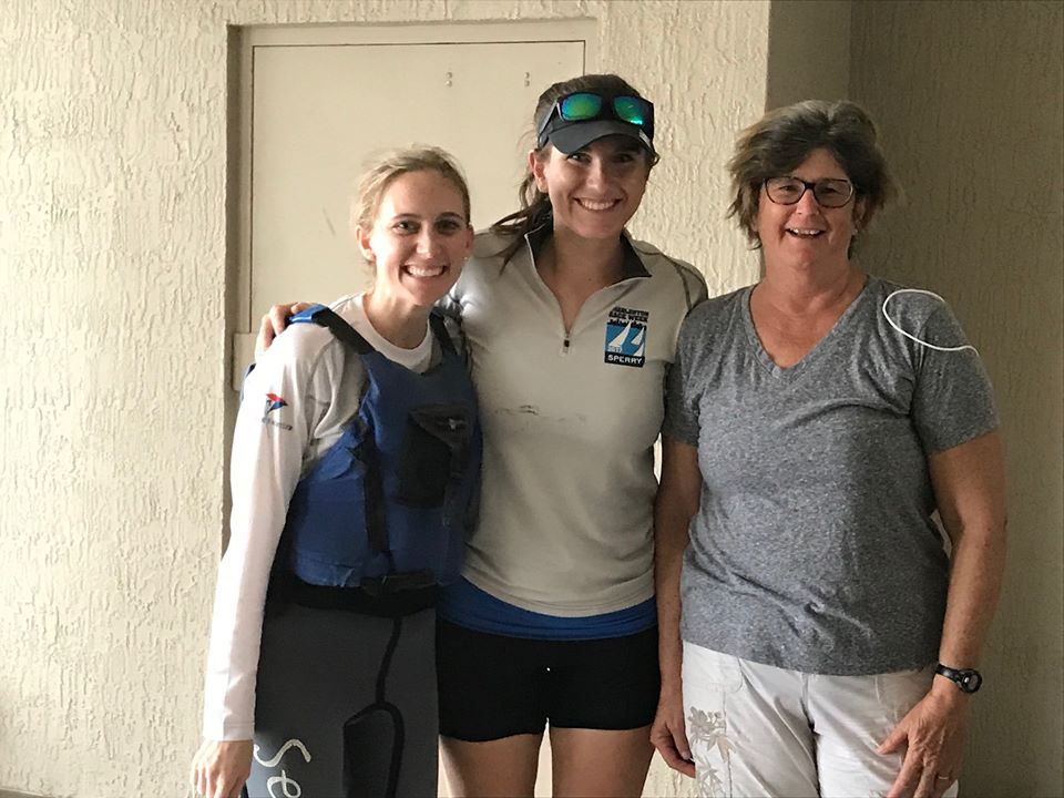 Lighter winds prevailed on day two with Scheuerman and Du Plessis winning two of the three final races. Rounding out the podium were Dubovik and Baab in second and Sharon Johnson and Tara Lobo in third. Ernesto Rodriguez and Peter Commette were the on-water fleet coaches of the day.
