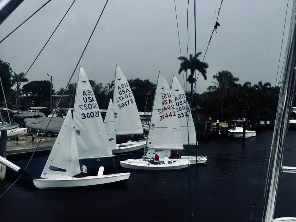 Ft. Lauderdale, Florida, May 19, 2018. Final results after 4 races 1. Augie Diaz & Kathleen Tocke, 8 2. Ernesto Rodriguez & Alex Sidi, 10 3. Peter Commette & Connie Commette, 11 By Connie Commette Wow! What a day! It was wild and crazy for all of us out in the ocean. Even with huge waves, pouring rain and the wind picking up to 30+ knots, the RC and sailors tried their best to have a race.... but mother nature was stronger and races were postponed. All so anxious and eager to sail, but the RC had no choice but to send us in with only one bent mast and some bruised egos after several capsizes. Fortunately, we were able to get in 4 good races in the protected Intracoastal Waterway right off the LYC dock. Augie Diaz and Kathleen Tocke got the band back together and beat us all. Ernesto Rodriquez and new crew Alex Sidi were second; Peter and Connie Commette were third. ...