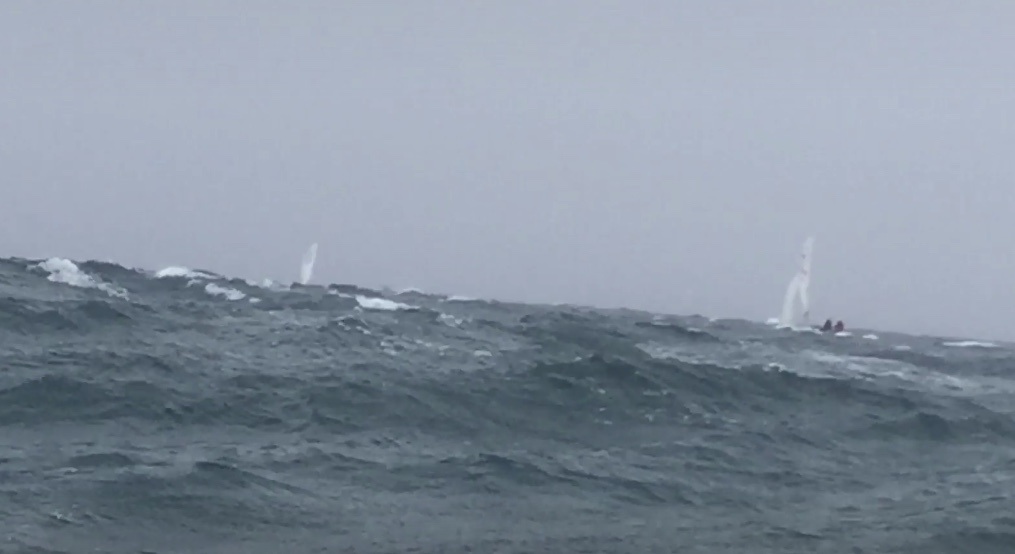 It was wild and crazy for all of us out in the ocean. Even with huge waves, pouring rain and the wind picking up to 30+ knots, the RC and sailors tried their best to have a race…. but mother nature was stronger and races were postponed. All so anxious and eager to sail, but the RC had no choice but to send us in with only one bent mast and some bruised egos after several capsizes. Fortunately, we were able to get in 4 good races in the protected Intracoastal Waterway right off the LYC dock. Augie Diaz and Kathleen Tocke got the band back together and beat us all. Ernesto Rodriquez and new crew Alex Sidi were second; Peter and Connie Commette were third.
