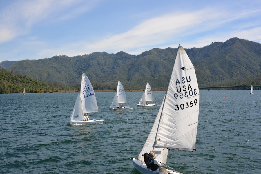 After sailing on San Francisco Bay sailing at Wiskeytown makes for a great change of scenery. Located in the Siskiyou mountains just west of Redding, it’s warm (shorts and t-shirts rarely seen on SF Bay) and the winds let us sit on the same side of the boat and only rarely needing to hike out.