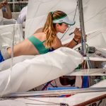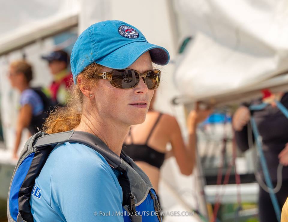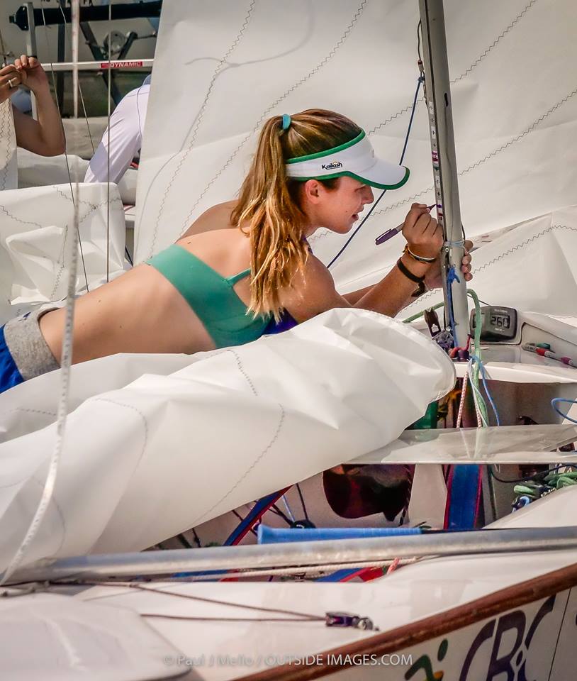 The race committee postponed onshore due to winds gusting above the 18 knot limit for the Women’s Championship. Augie Diaz walked around the fleet making sure that teams had pins in the spreaders and knew how to prevent their masts from inverting. Only two teams stayed onshore when the postponement glad was lowered.